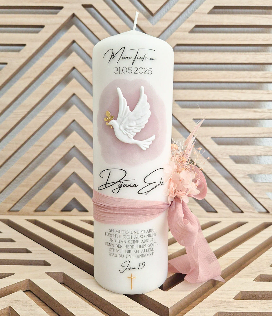 Die hochwertige Taufkerze mit einer Taube aus Wachs und einem Aquarell in rosa Tönen ist eine wundervolle Idee für die Taufe deines Kindes.